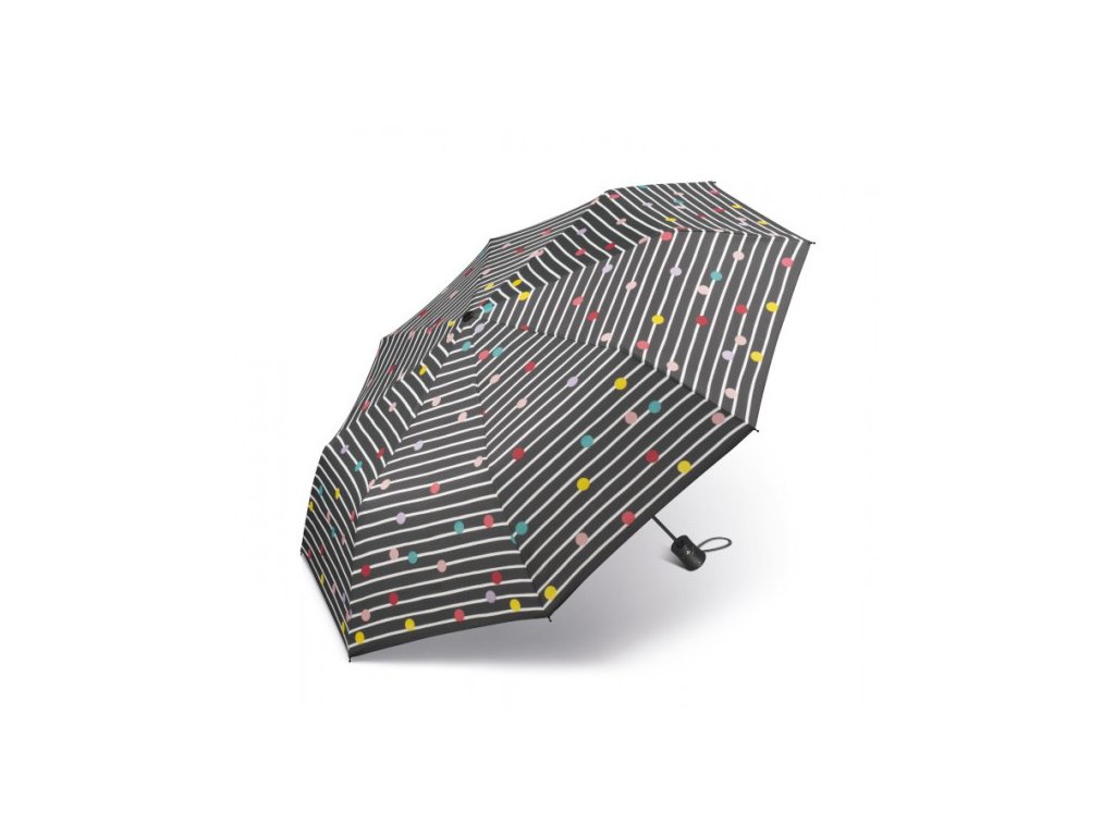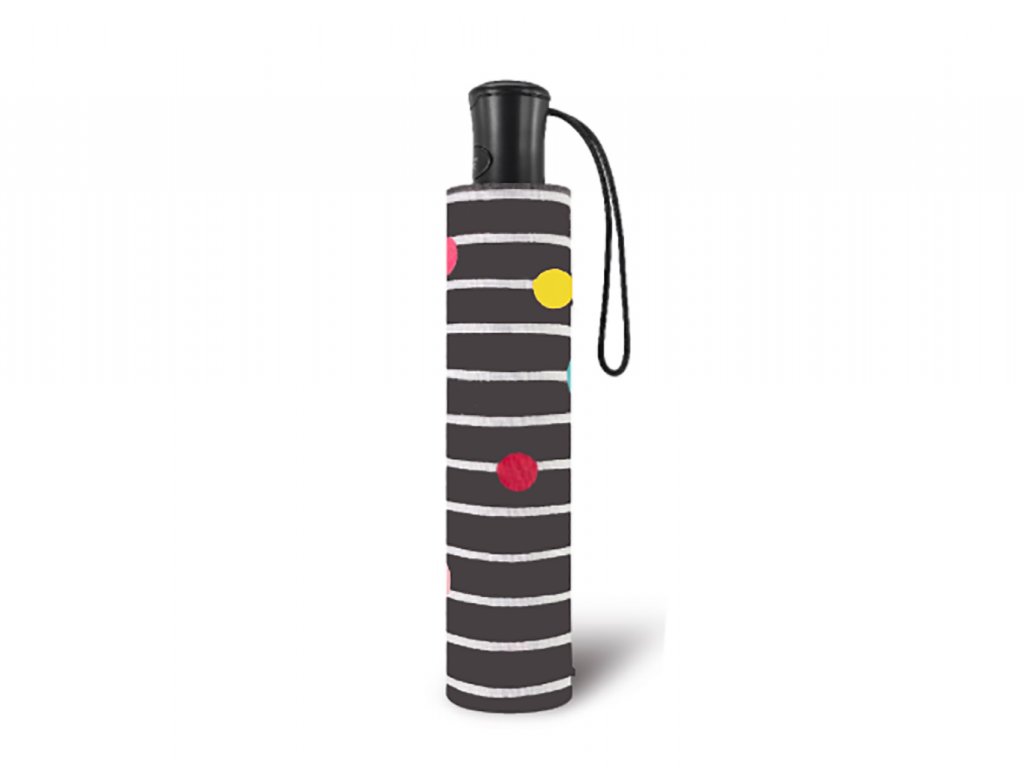 Dámský plně automatický deštník Happy Rain Bikini Dots & Stripes. Šedý s bílým proužkem a barevnými puntíky.